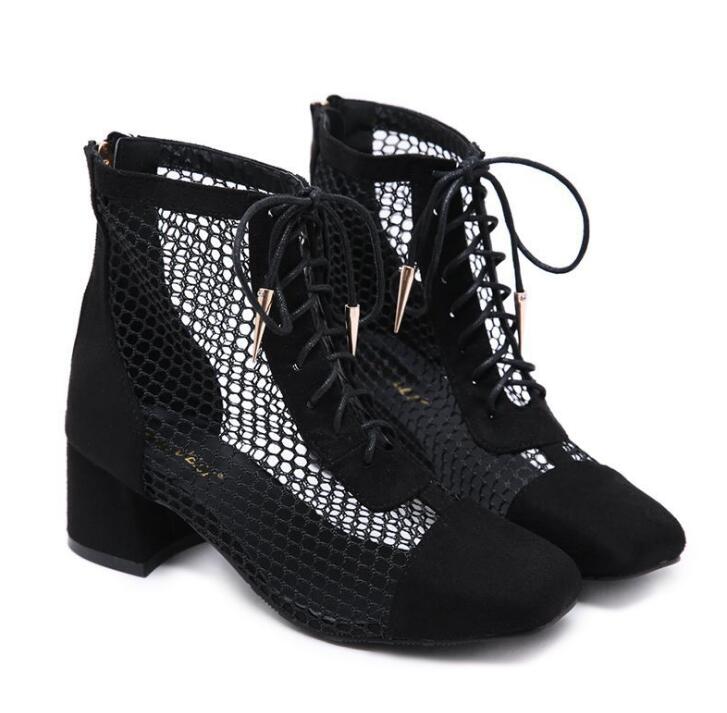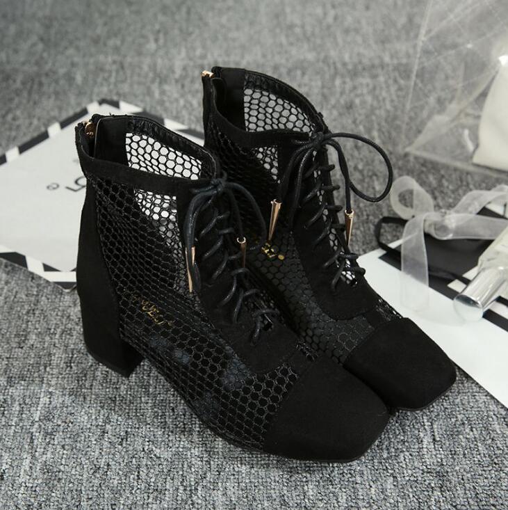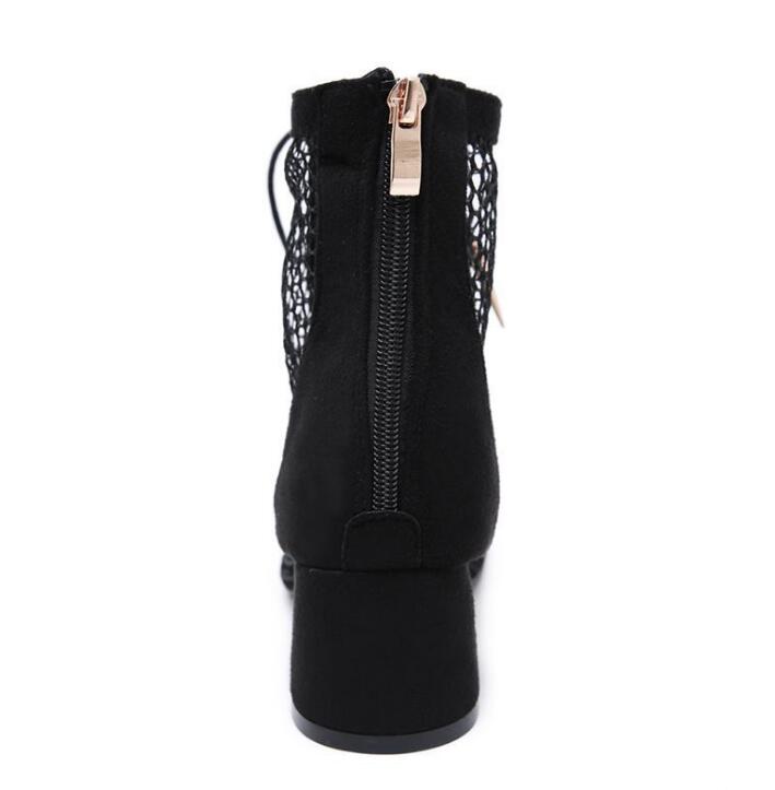 Block Heels Ankle Boot Women's Short Boots Hollow Mesh Mid-heel Short Tube Lace-up Shoes