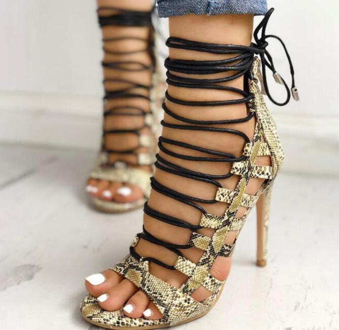New cross-lace snake-print stiletto high-heel pointed-toe women's sandals