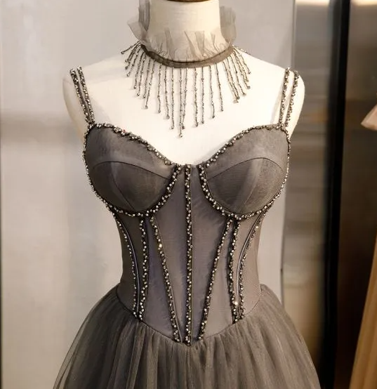 A-Line / Princess Spaghetti Straps Beading Tassel Crystal Sleeveless Backless Floor-Length / Long Formal Dresses