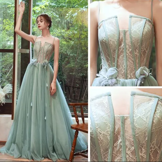 A-Line / Princess Spaghetti Straps Sleeveless Appliques Flower Feather Beading Sweep Train Ruffle Backless Formal Dresses