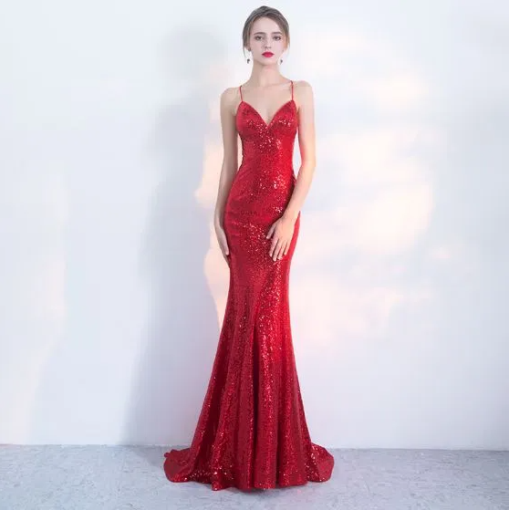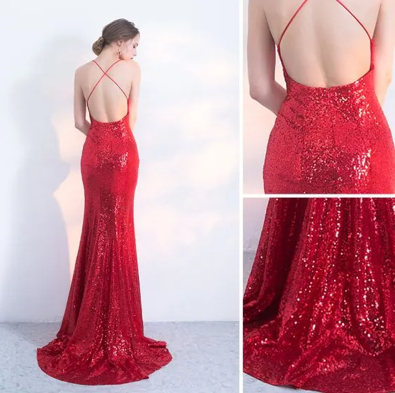 Sexy Evening Dresses Trumpet / Mermaid Sequins Spaghetti Straps Backless Sweep Train Sleeveless Formal Dresses