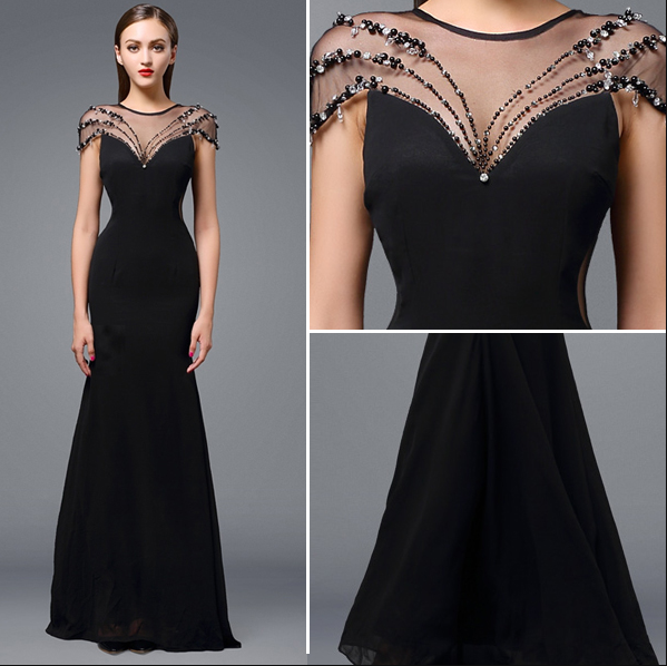 Stunning Scoop Neckline Backless Beading Rhinestone Black Silk Evening Dress