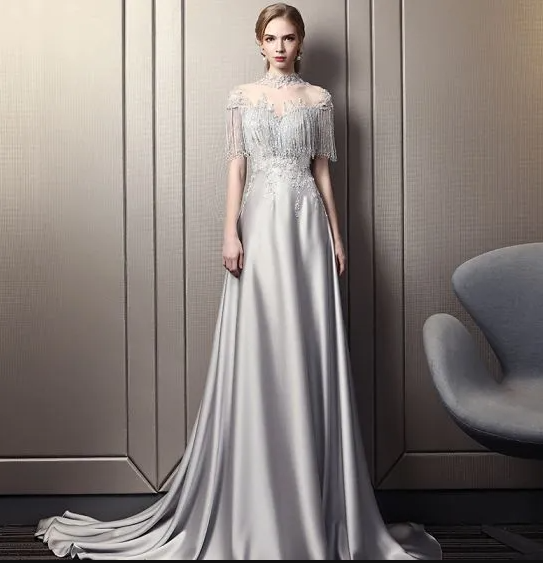 High Neck Cap Sleeves Beading Crystal Tassel Cathedral Train Ruffle Backless Formal Dresses