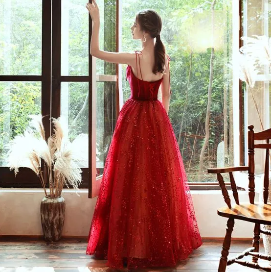 A-Line / Princess Spaghetti Straps Sleeveless Beading Glitter Tulle Floor-Length / Long Ruffle Backless Formal Dresses
