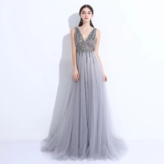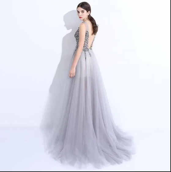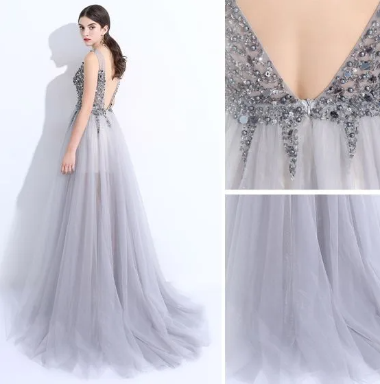 V-Neck Backless Sleeveless Sweep Train Formal Dresses