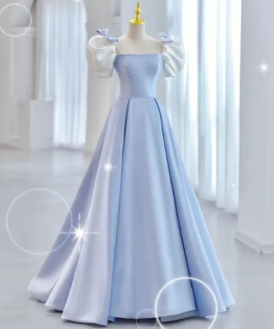 Puff-Sleeve Two Tone Bow A-Line Evening Gown