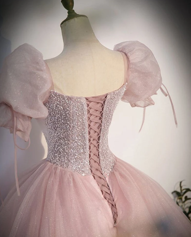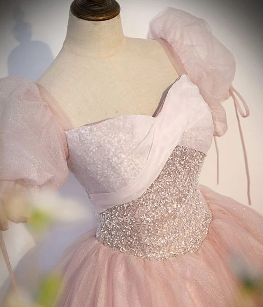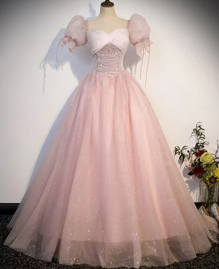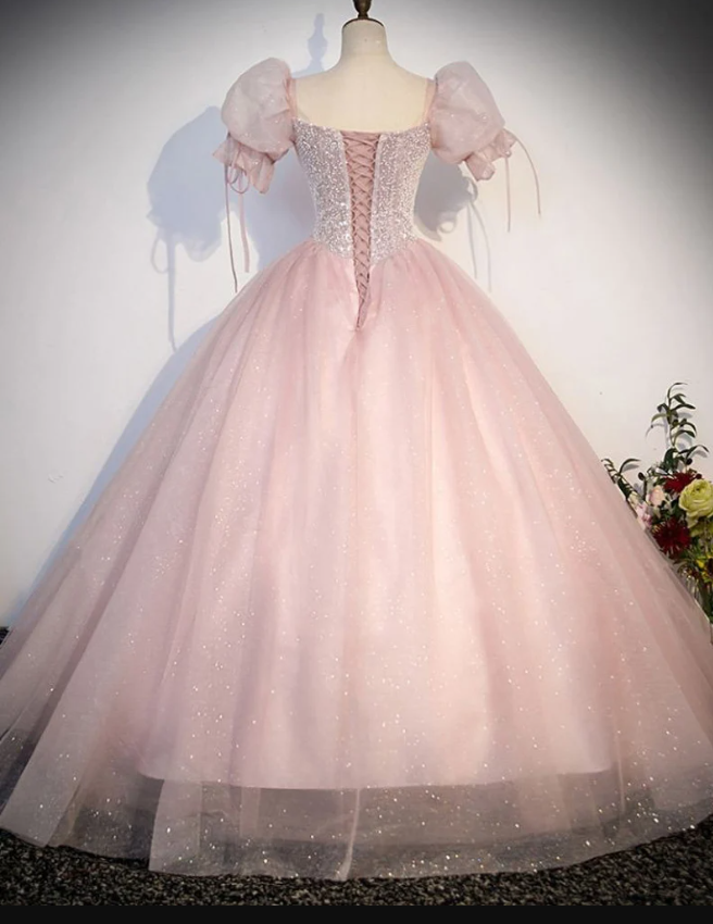 Bling Pink Tulle a line Ball Gown,lace applique Prom Gowns ,Princess Prom Dress Gown,Beaded Bridesmaid Dress