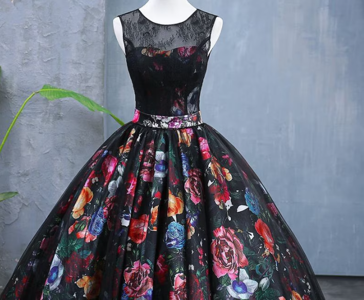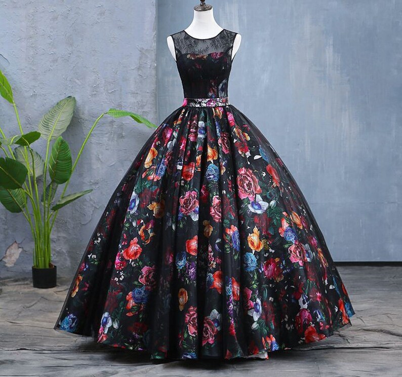 Black Printed satin a line ball Gown,Scoop lace prom Dress,Princess Formal party dress,long wedding dress