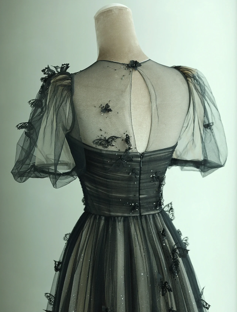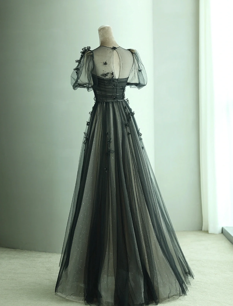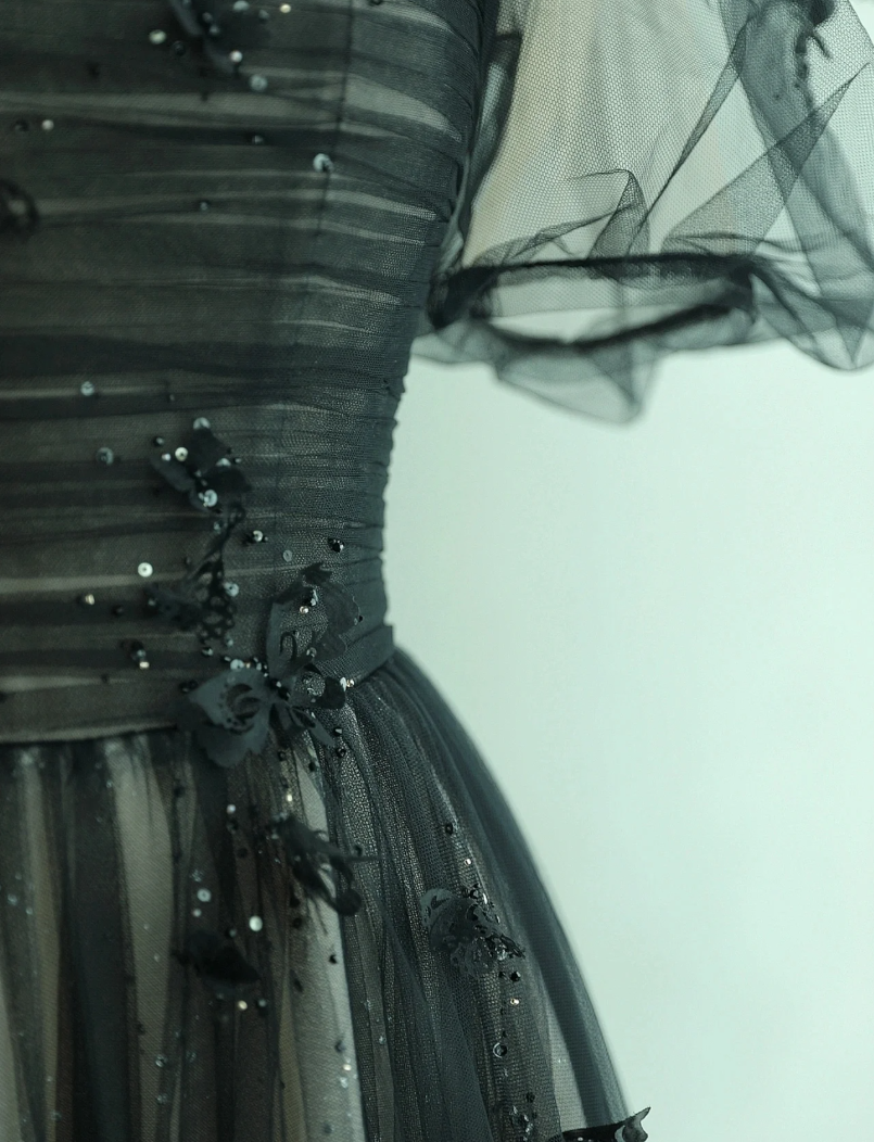 A-line Prom Dress, Black Evening Dress Party Dress Black Tulle Puffy Short Sleeves