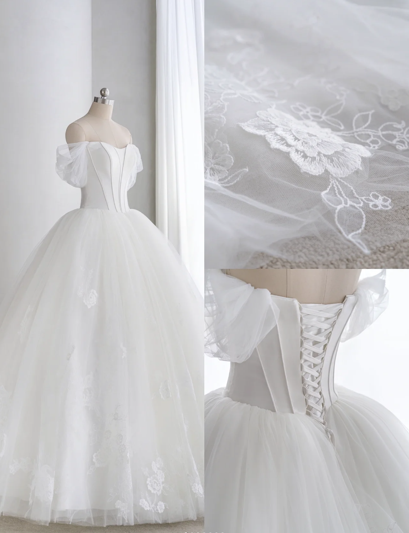 Luxurious custom white wedding dress floor length bridal gown princess wedding dress off shoulder satin tulle skirt