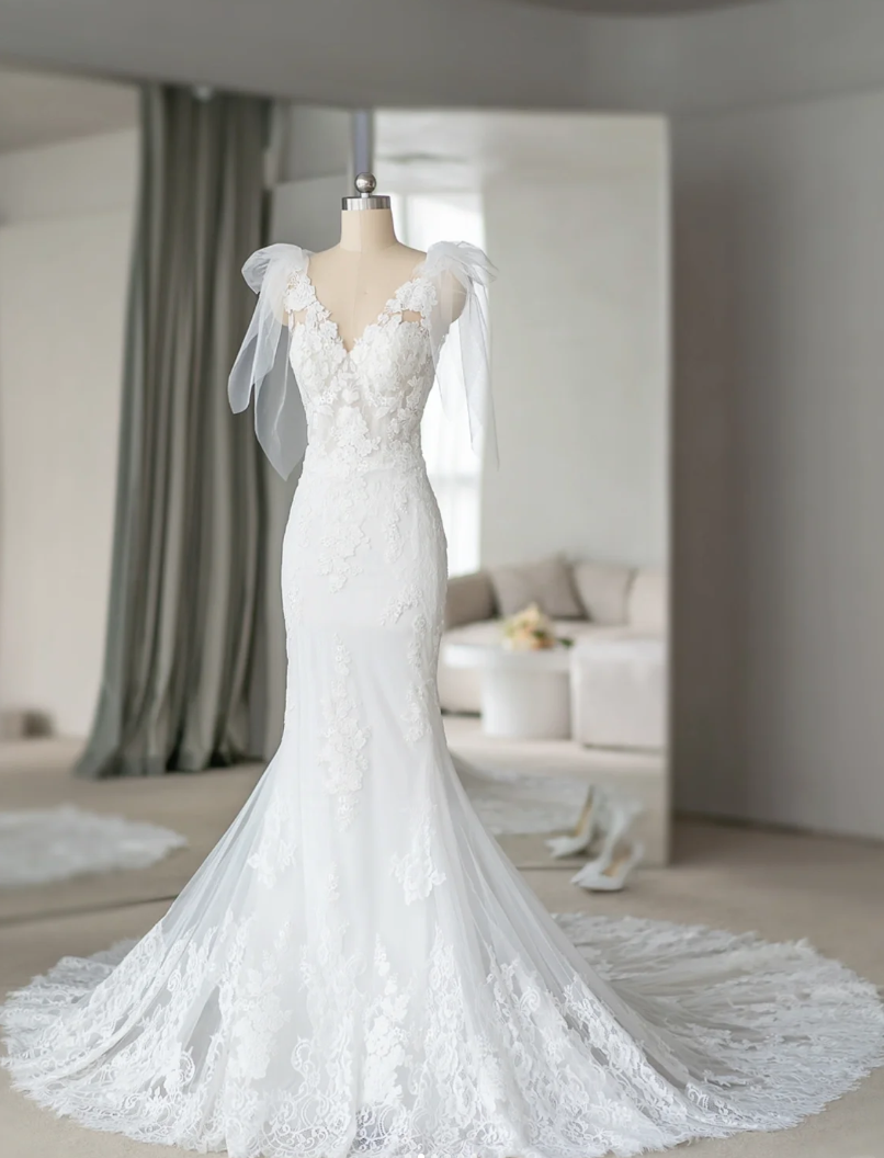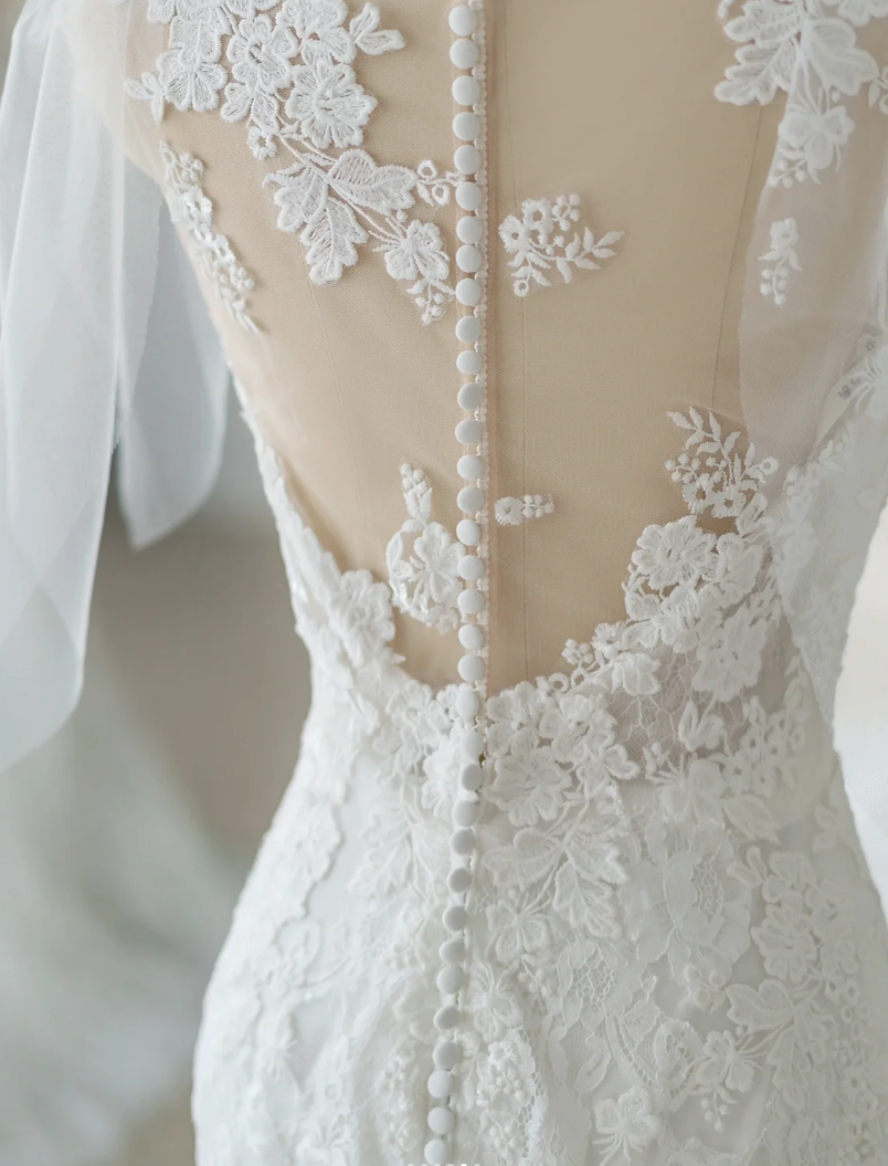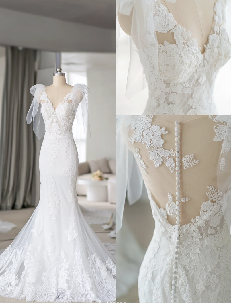 Luxurious Lace Appliqué Sequin Mermaid Wedding Dress V Neck Backless Church Train Bridal Gown Button Wedding Dress