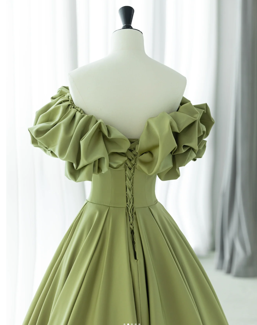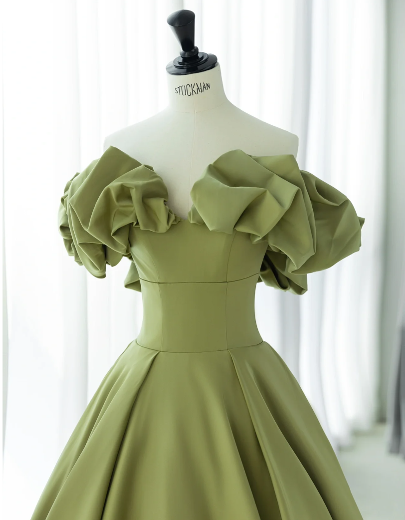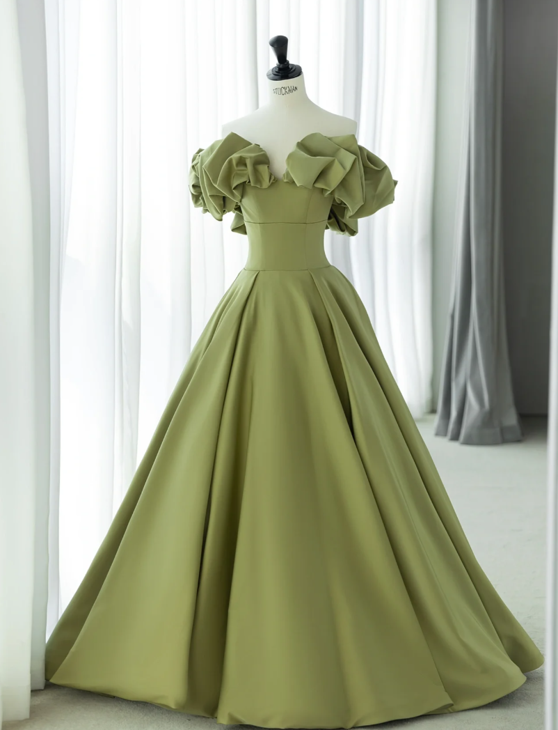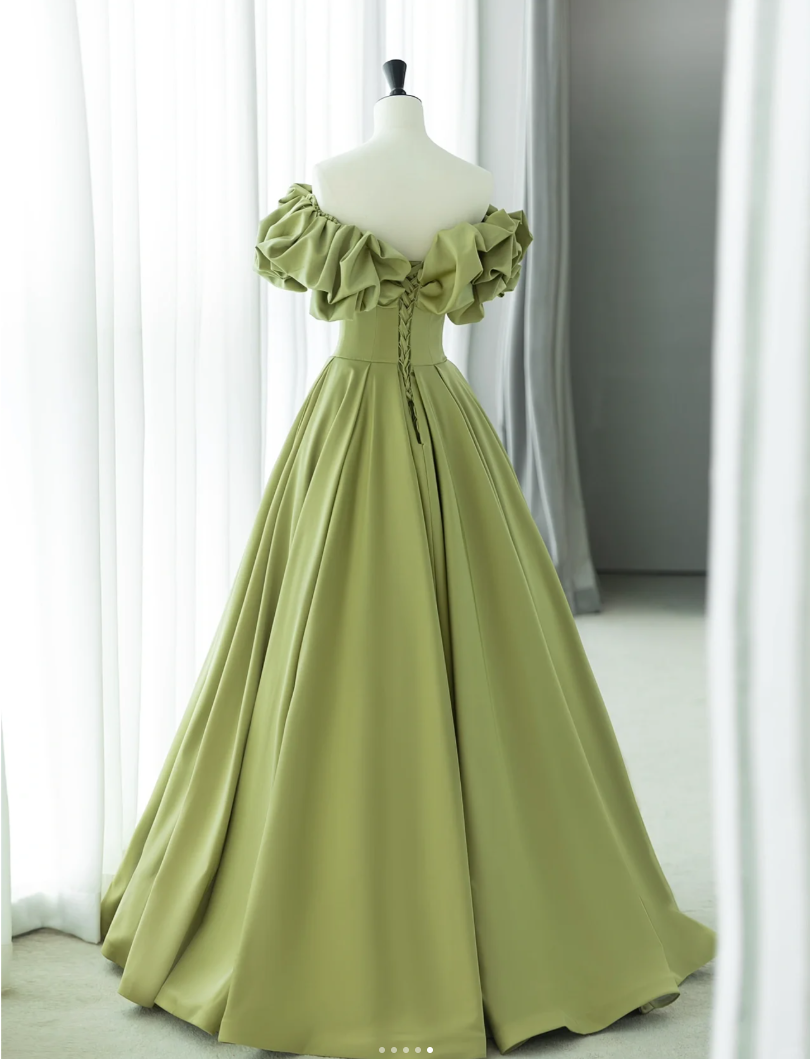 Green Satin Off Shoulder Body Fit Flat Chest Neckline Prom Dress A Line Party Dress Prom Dress Homecoming Dress Wedding Dress Banquet Dress