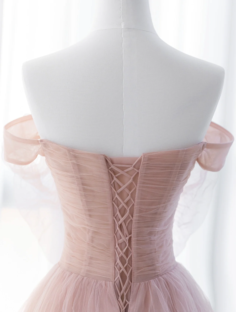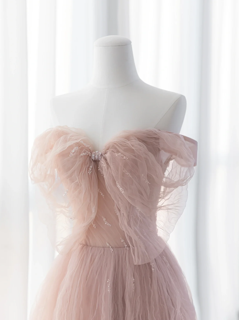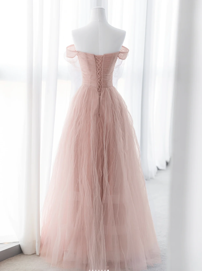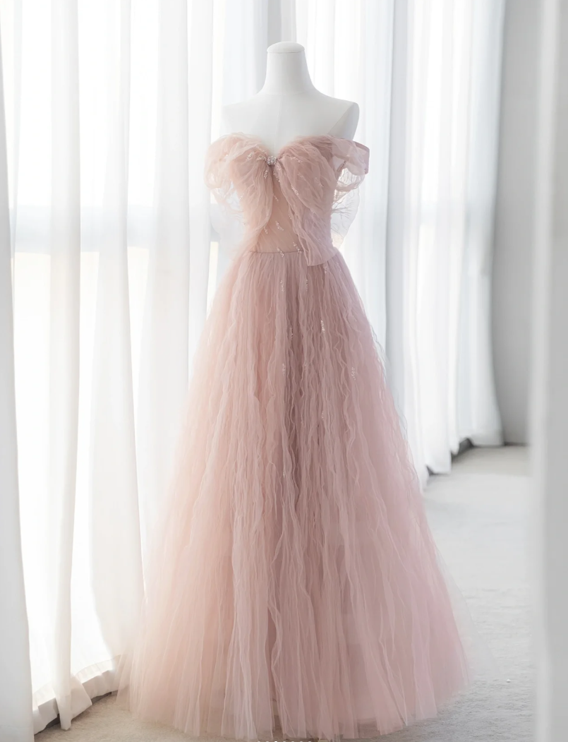 Pink Tulle Long A-Line Sweetheart Off-The-Shoulder Ball Gown, Pink Bow Party Evening Gown