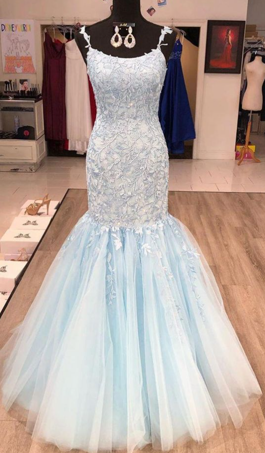 Sleeveless Prom Dresses Blue Lace Tulle Evening Dresses