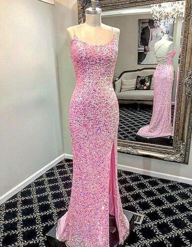 A Line Pink Sequin Cross Back Long Prom Dresses