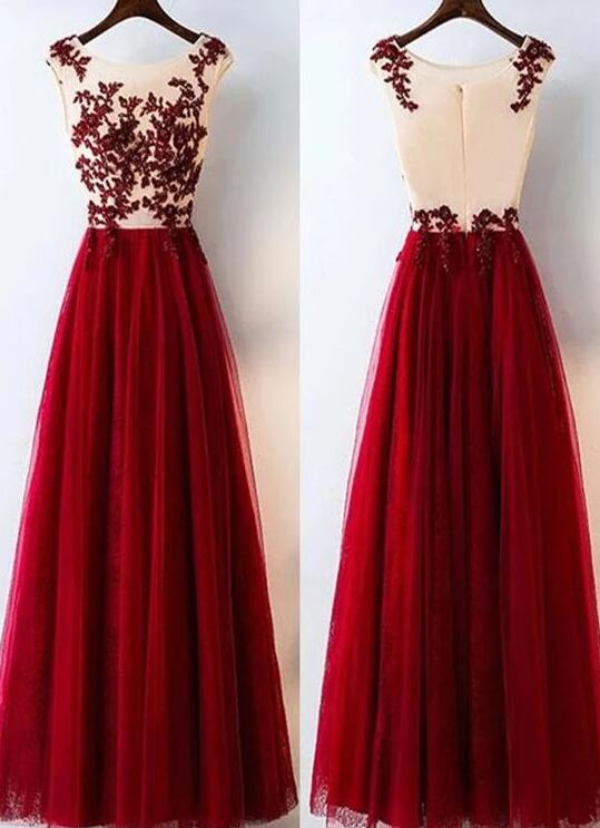 A-line Pretty Burgundy Lace Tulle Long Prom Dress, Evening Gown