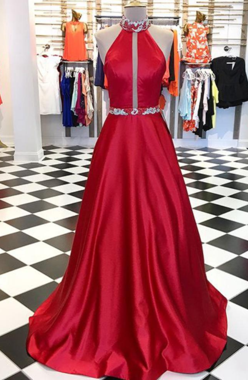 High Neck Long Prom Dresses With Beading,party Dress,evening Dresses
