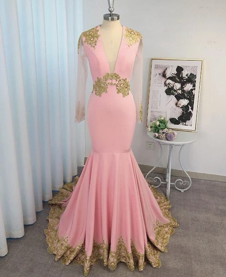 trumpet/mermaid Silk Like Satin Applique Long Sleeves V-neck Sweep/brush Train Dresses