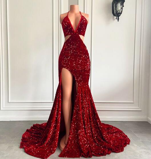 Sexy Halter Neck Sequin Burgundy Prom Dresses With Slit