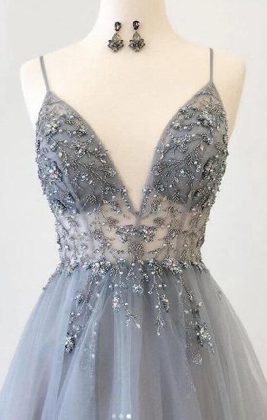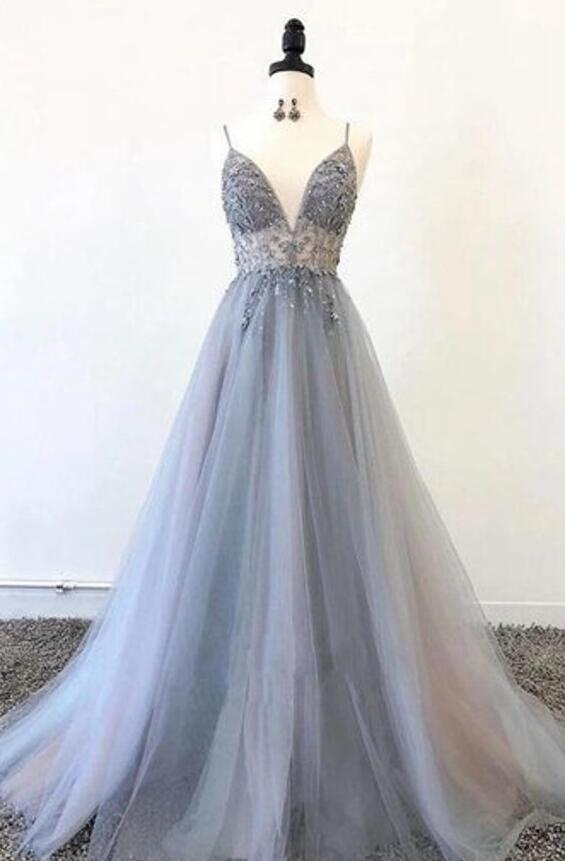 Spghetti Straps Gray Tulle Evening Gowns