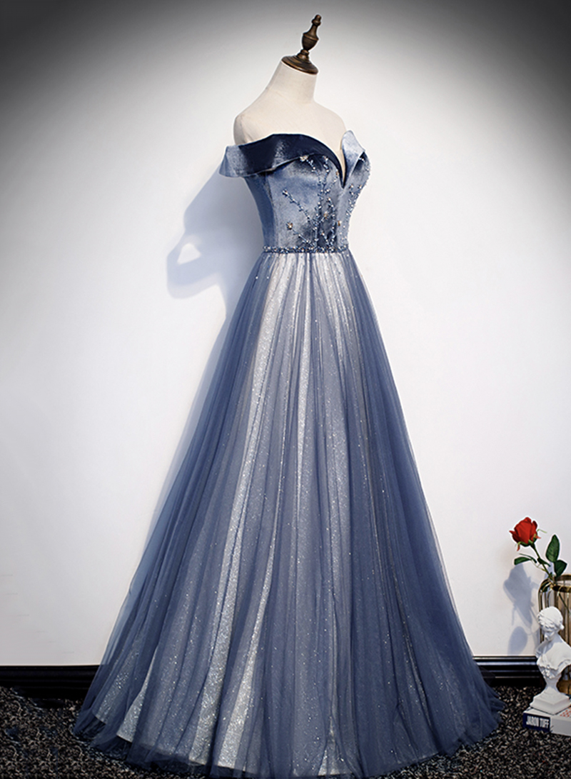 Blue Velvet Tulle Long Prom Dress Evening Dress