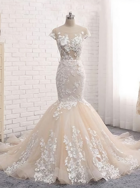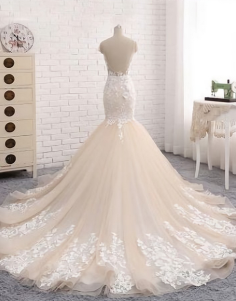 Elegant Mermaid Backless Appliques Tulle Formal Prom Dress,