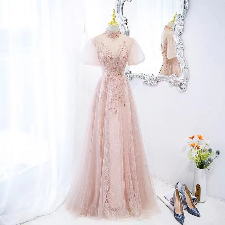 Luxury Party Dress, High Neck Evening Dress,noble Pink Party Dress,handmade,