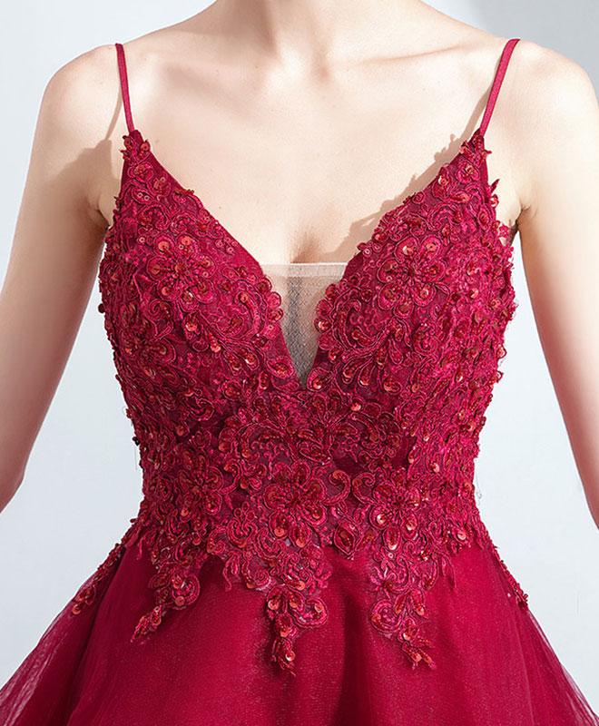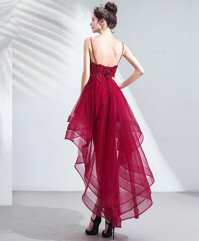 Burgundy Tulle Lace High Low Prom Dress Lace Homecoming Dress
