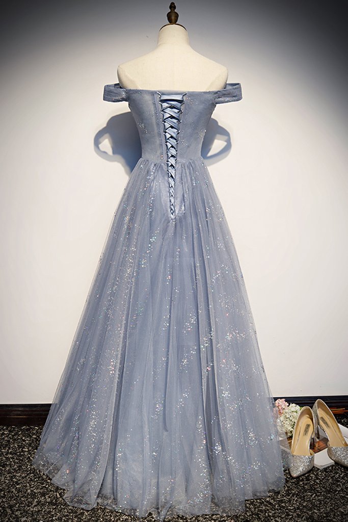 Strapless Blue Tulle Beaded Long A Line Off Shoulder Prom Dress, Evening Dress