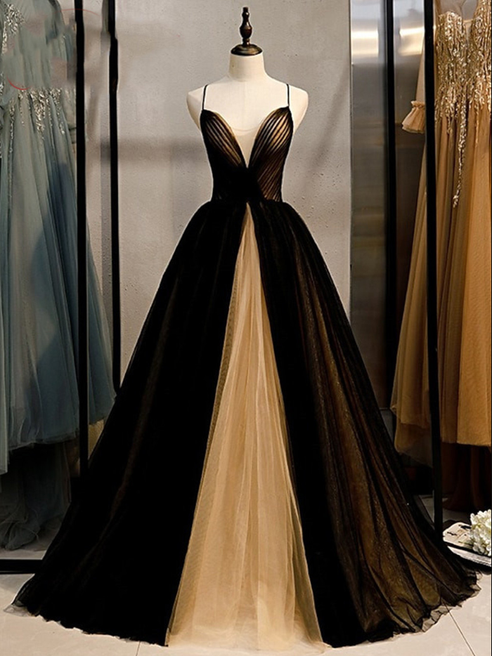 a-line Tulle Pleated Colorblocked Evening V-neck Cross Back Strappy Dress