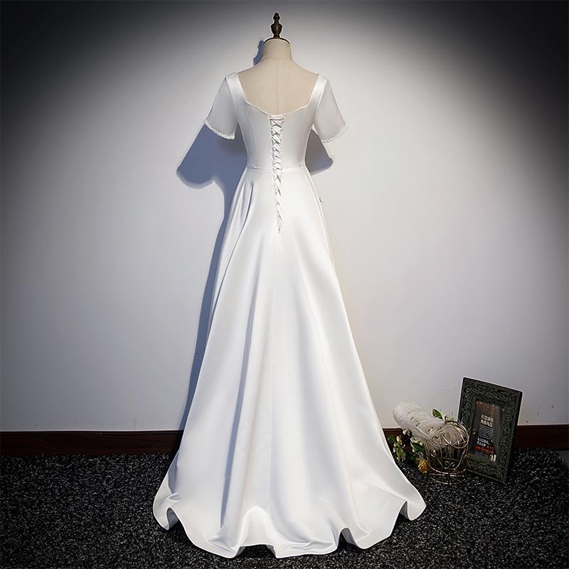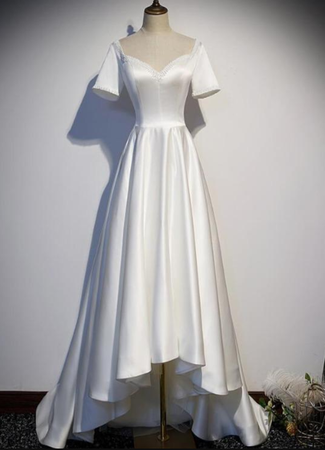 high Low White Satin Prom Dresses Simple Long Formal Evening Gowns Pearl Beaded Wedding Dresses